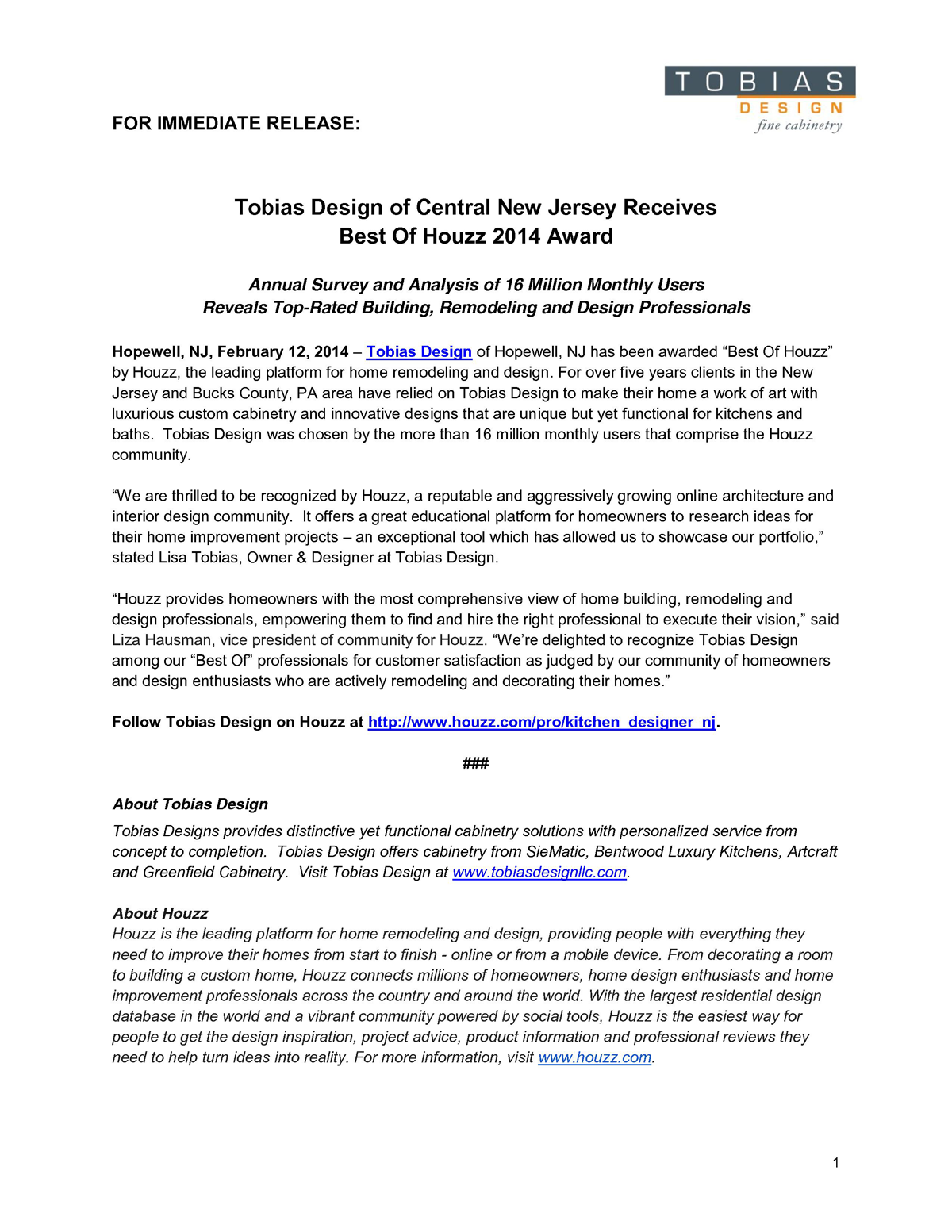 2020 Best of Houzz Awarded to Tobias Design Tobias Design, LLC, specializing in kitchen and bath design, has won a “Best Of Houzz” award for Customer Service on Houzz®, the leading platform for home renovation and design.